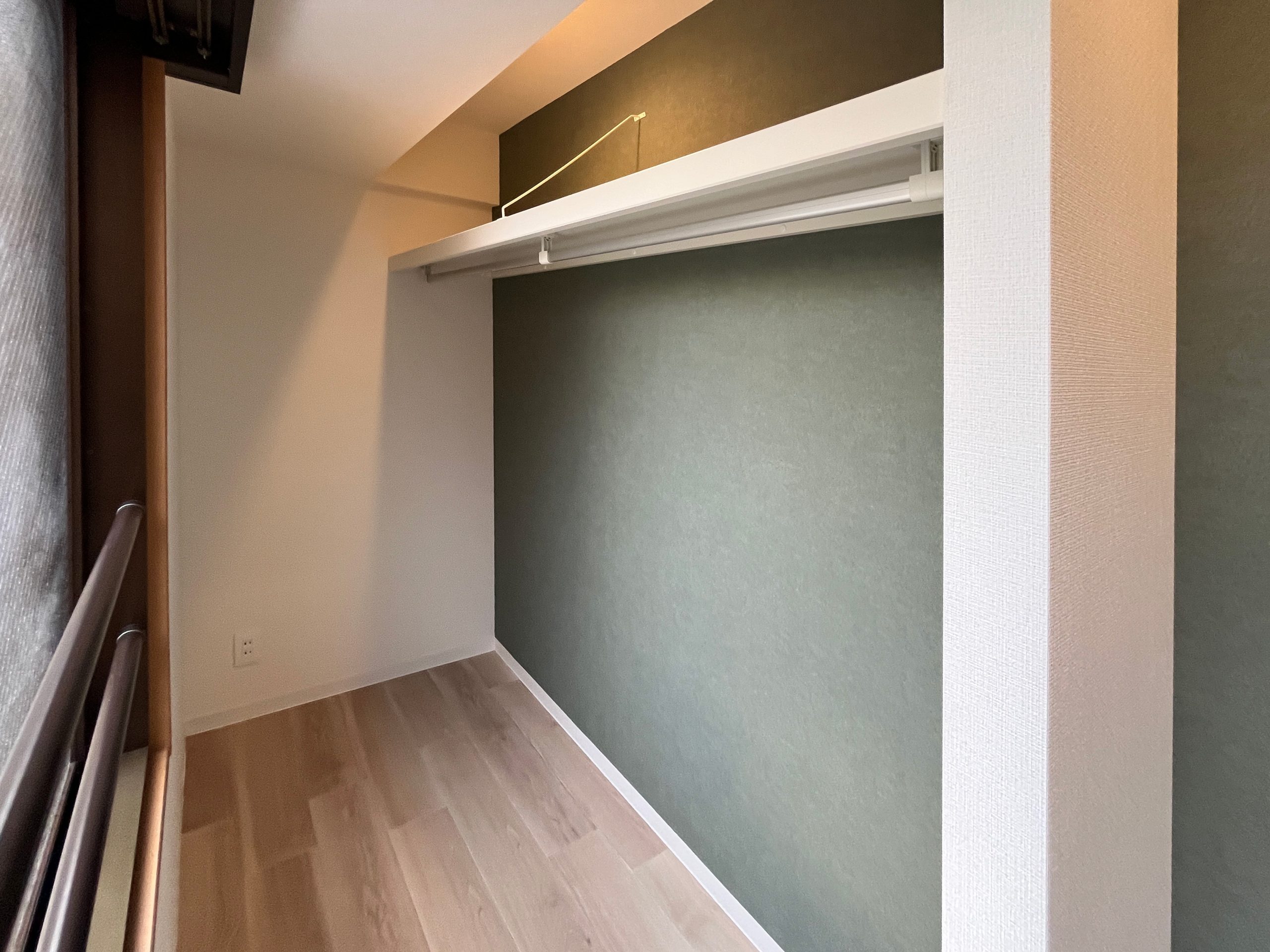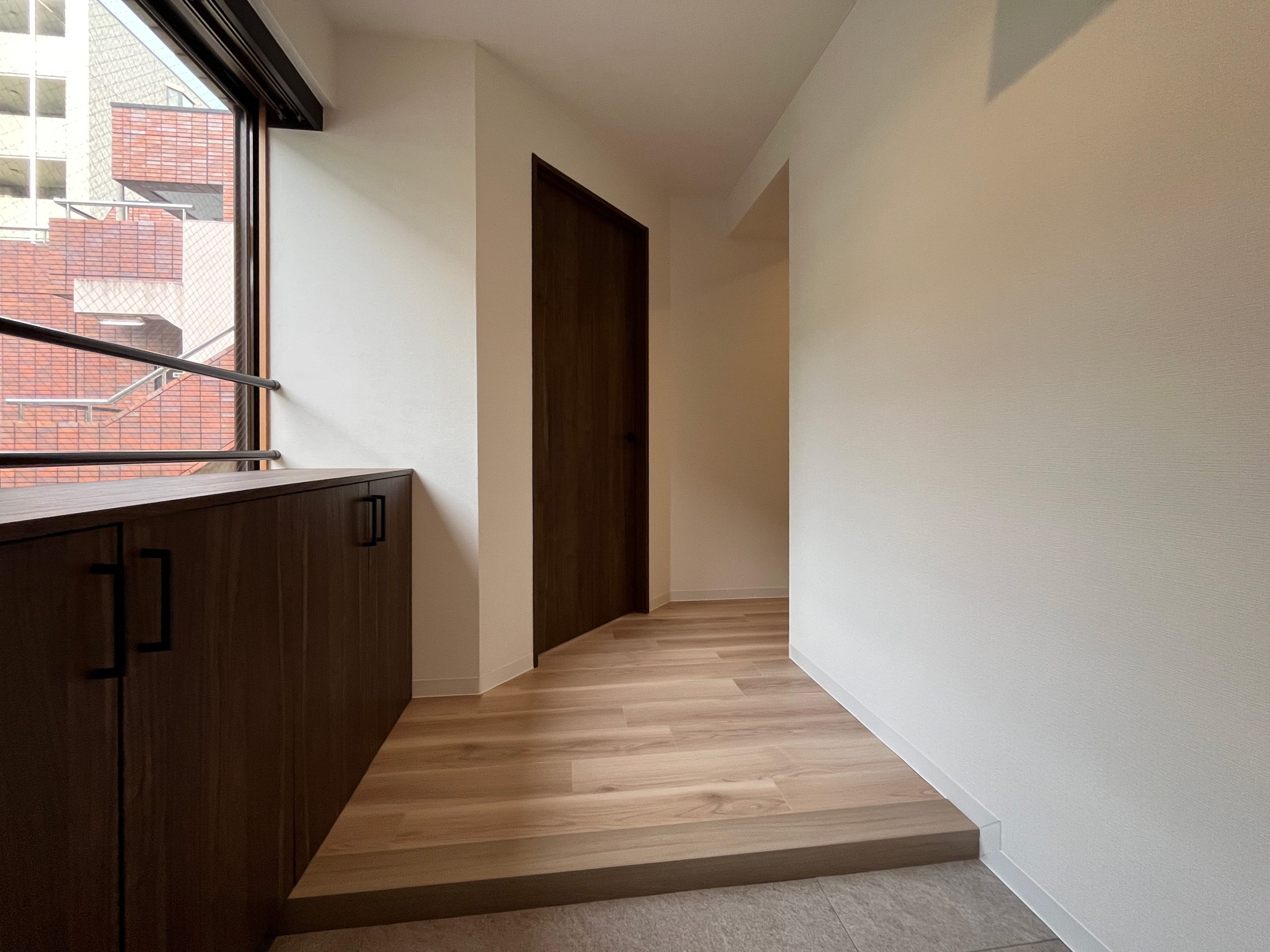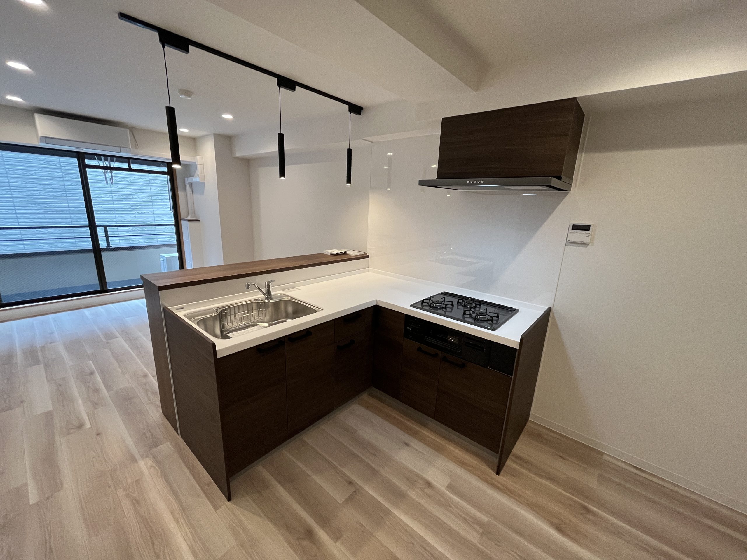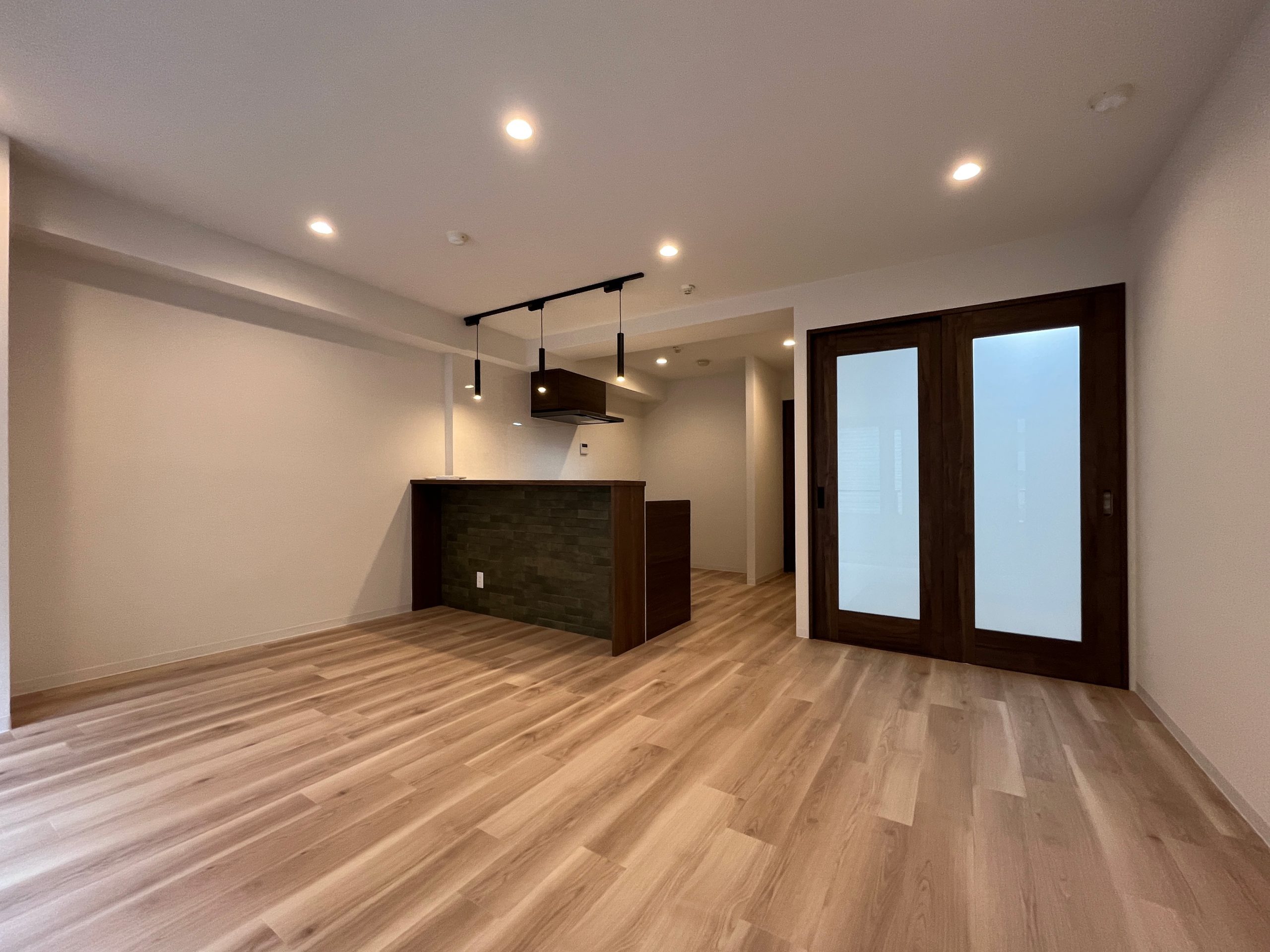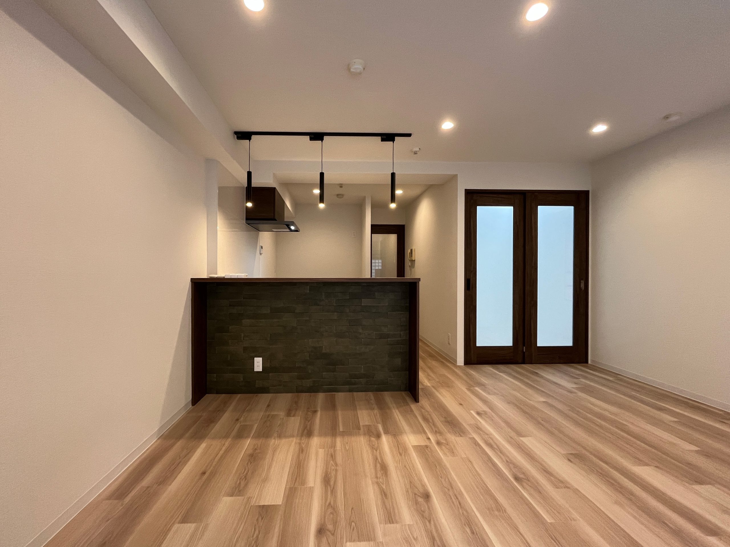 外壁に施されたレトロなタイルが印象的なこの物件。内装もその雰囲気を活かし、レトロな趣を感じさせるデザインに仕上げています。ウォールナットを基調とし、異素材のテラゾー柄タイルやカーキのタイルを組み合わせることで、レトロな風合いを保ちつつも、シンプルでモダンな空間を実現しました。 L型の広々としたカウンターキッチンを採用し、大きな窓のある北西側にLDKを配置。さらに広々としたウォークインクローゼットを設けることで、使い勝手の良さや内見時の家具配置のイメージのしやすさを重視したプラントなっています。