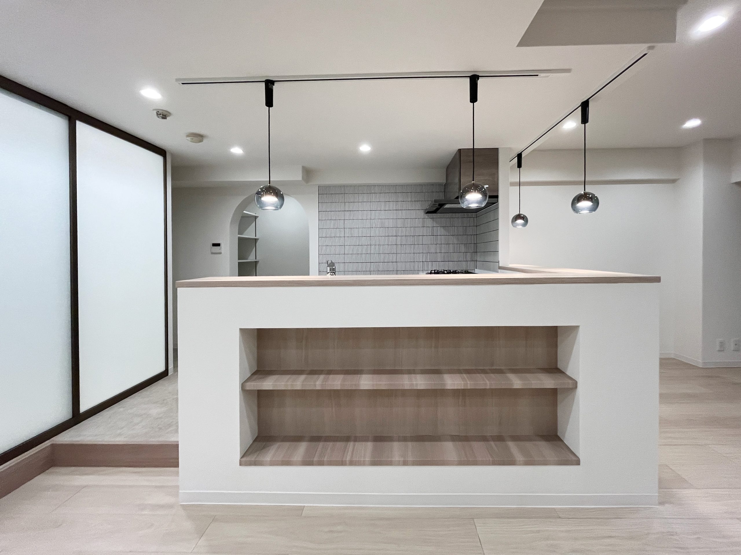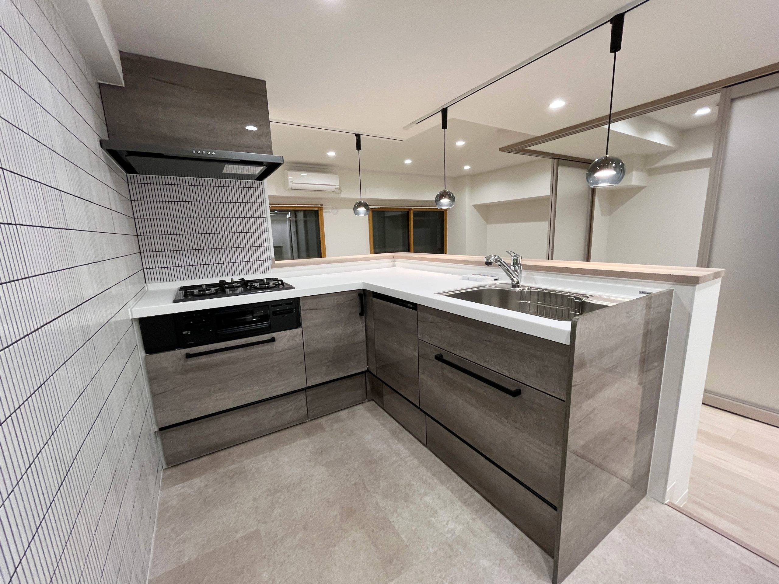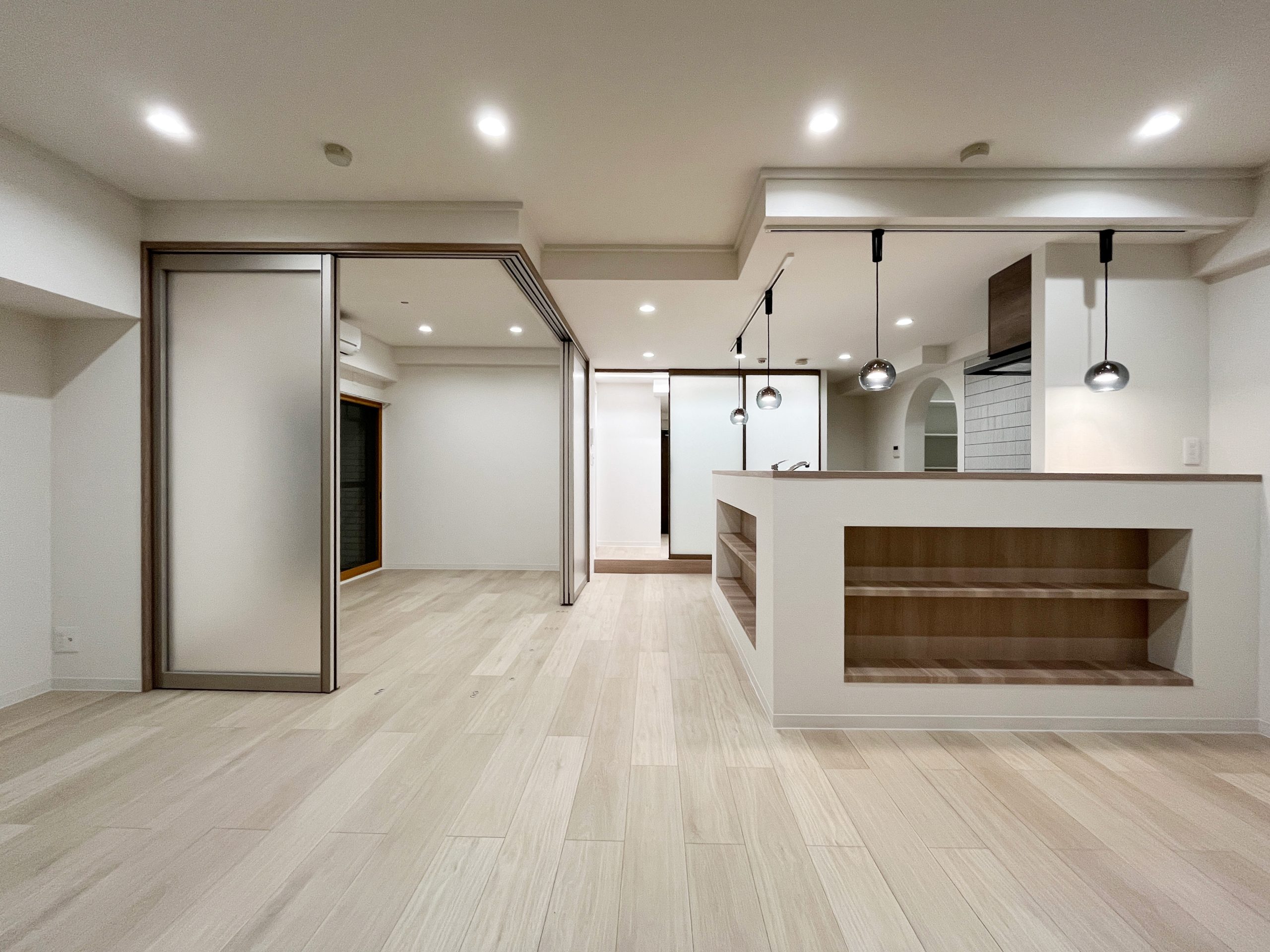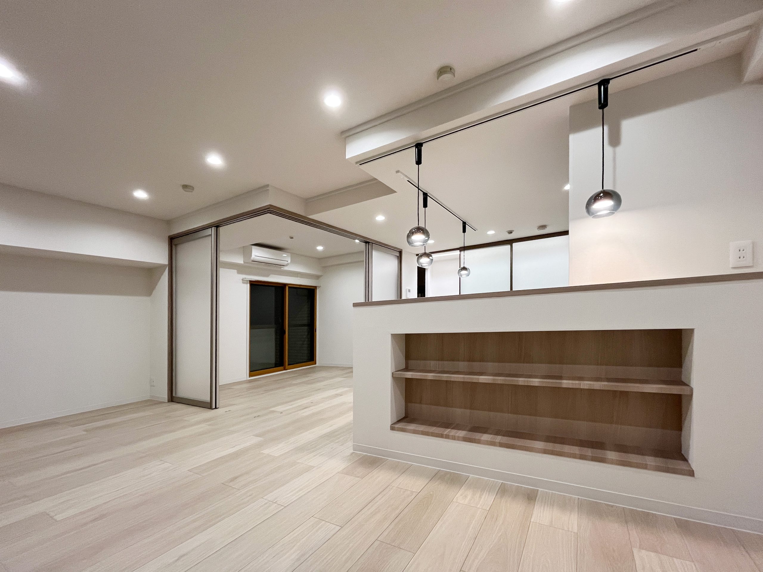 内装はベージュを基調としたお部屋をご用意。ベージュとグレーの絶妙なバランスが落ち着きのある雰囲気を演出し、居心地のよい空間を生み出します。大きなL型のカウンターキッチンにリノベーションを行い、お料理好きな人も住みたいと思っていただけるお部屋となりました。またLDK横の洋室には室内窓とスクリーンウォールを採用。LDKと洋室を物理的に仕切りながらも、ふと視線の先に家族の気配ややわらかな光が感じられる、つながりのある穏やかな空間となります。