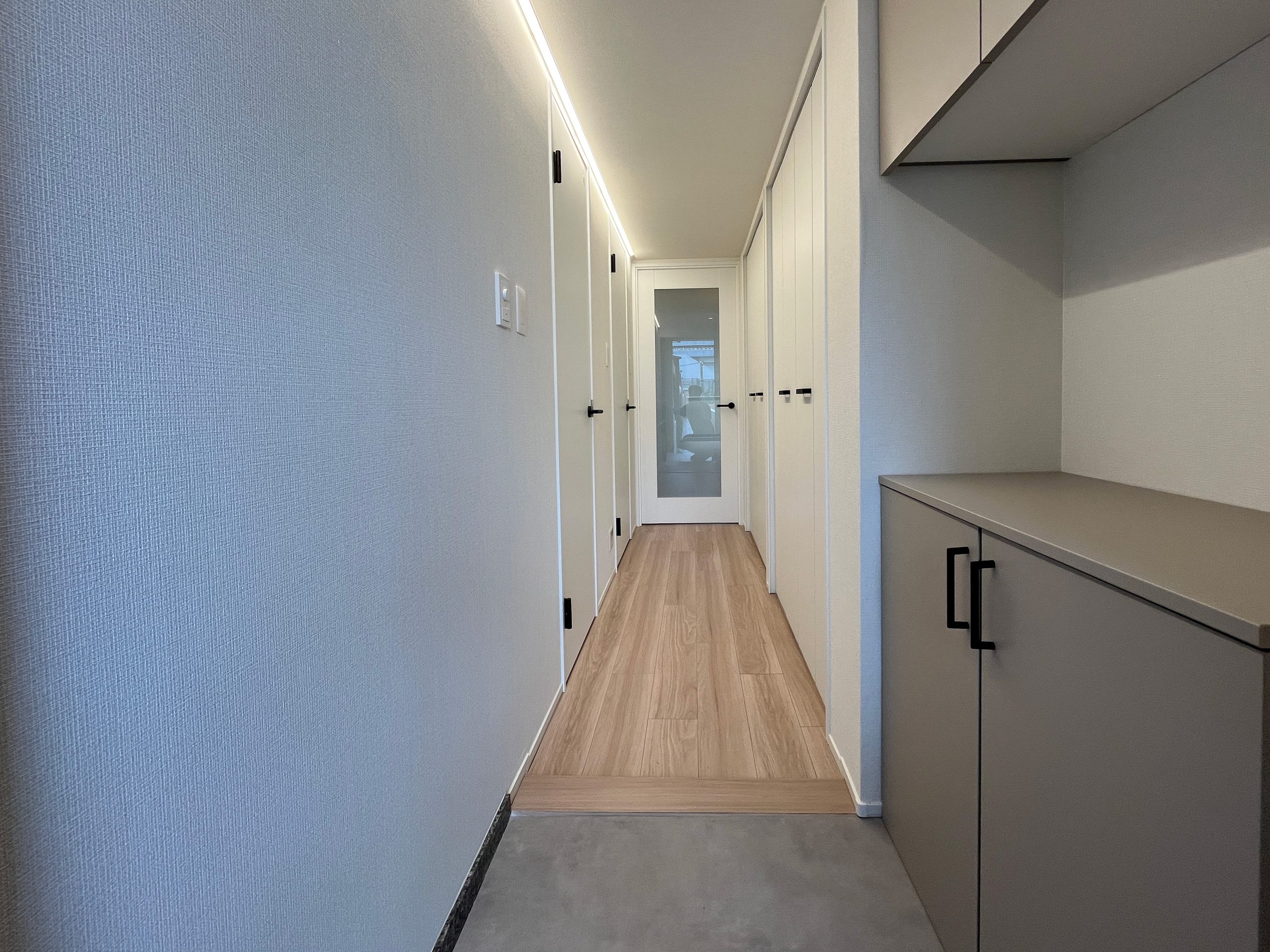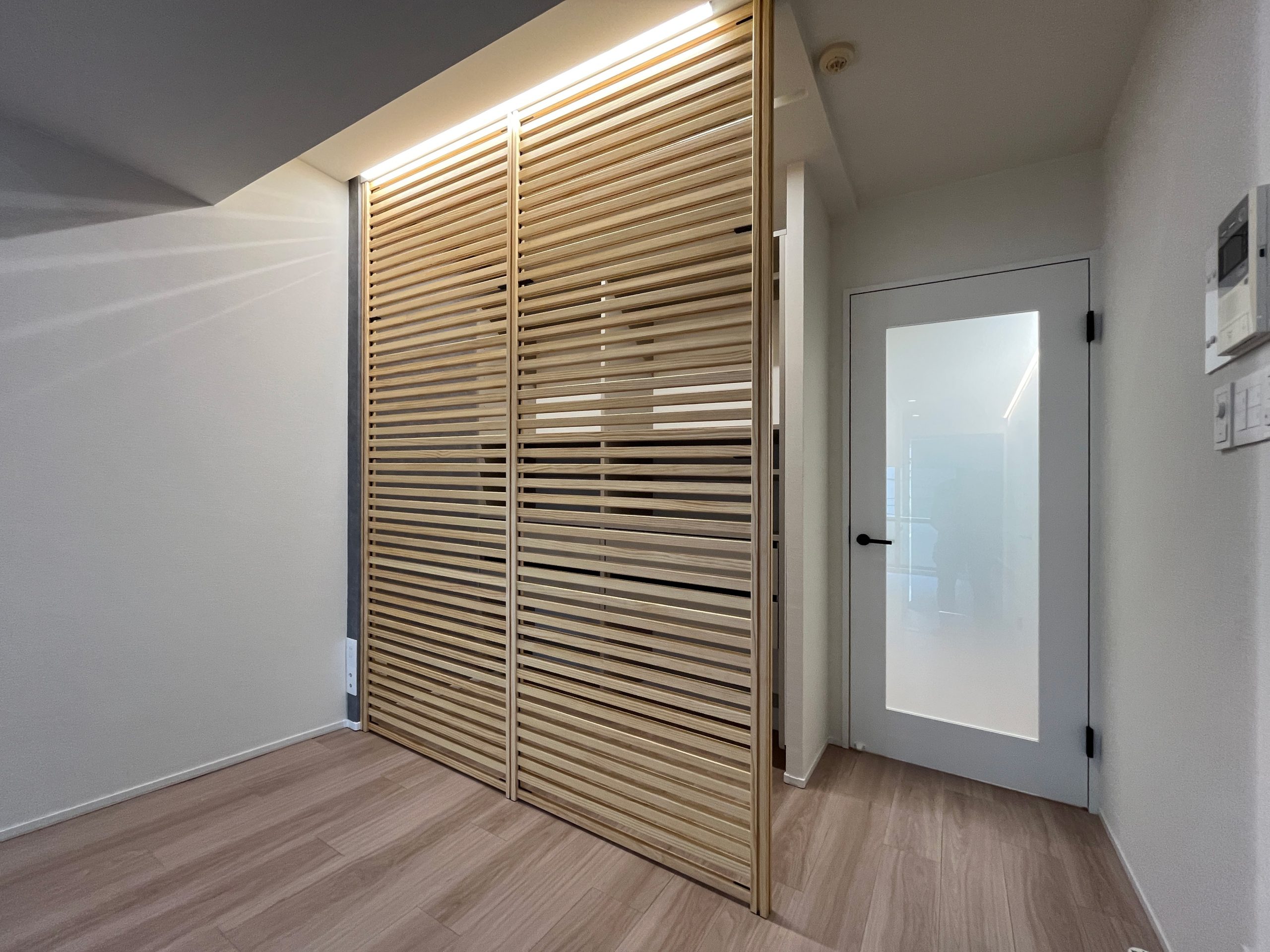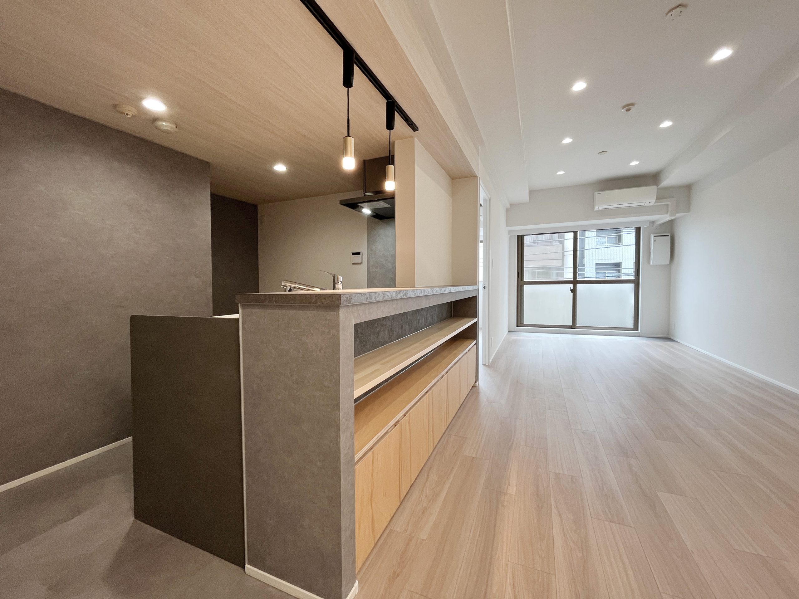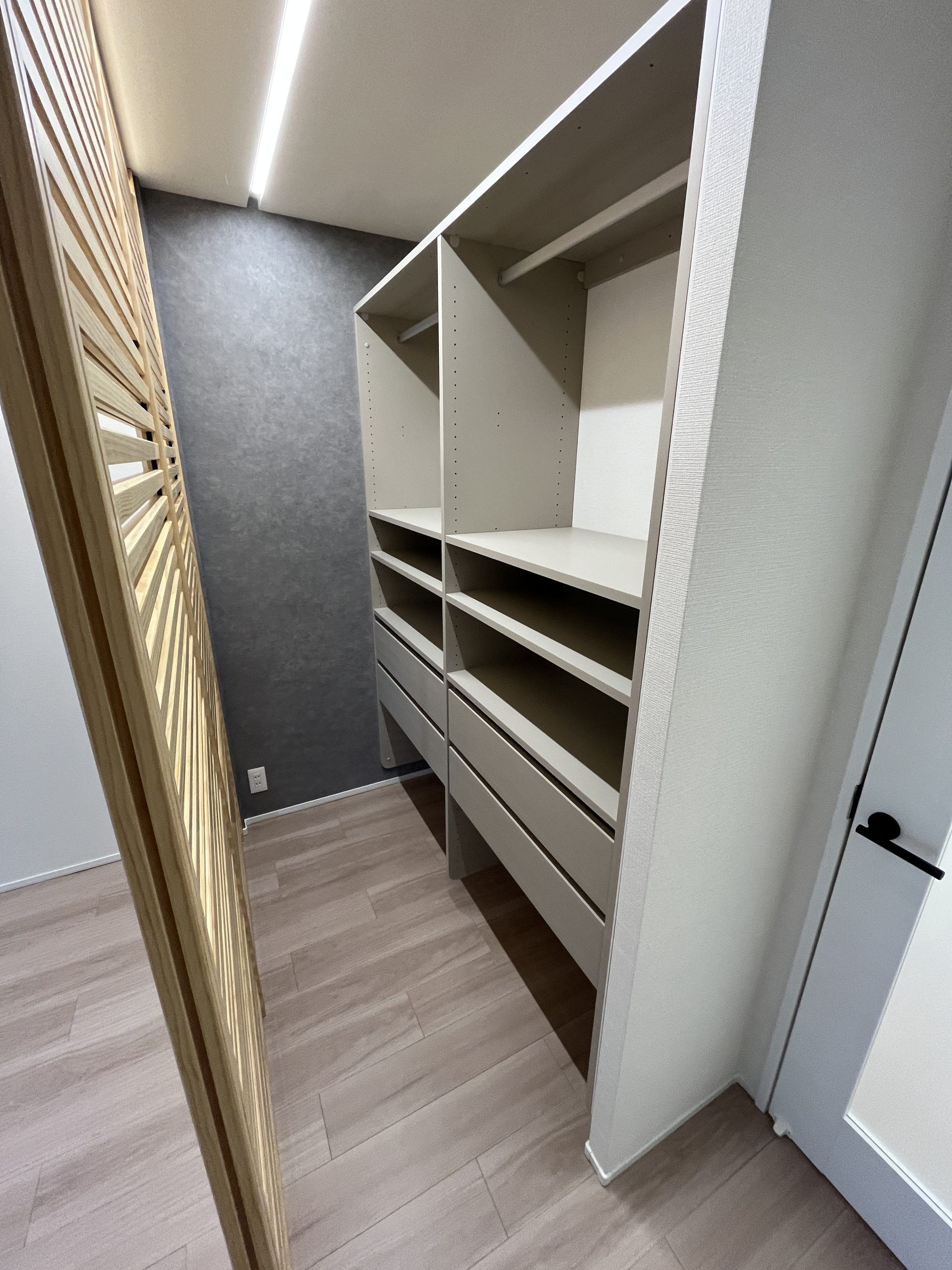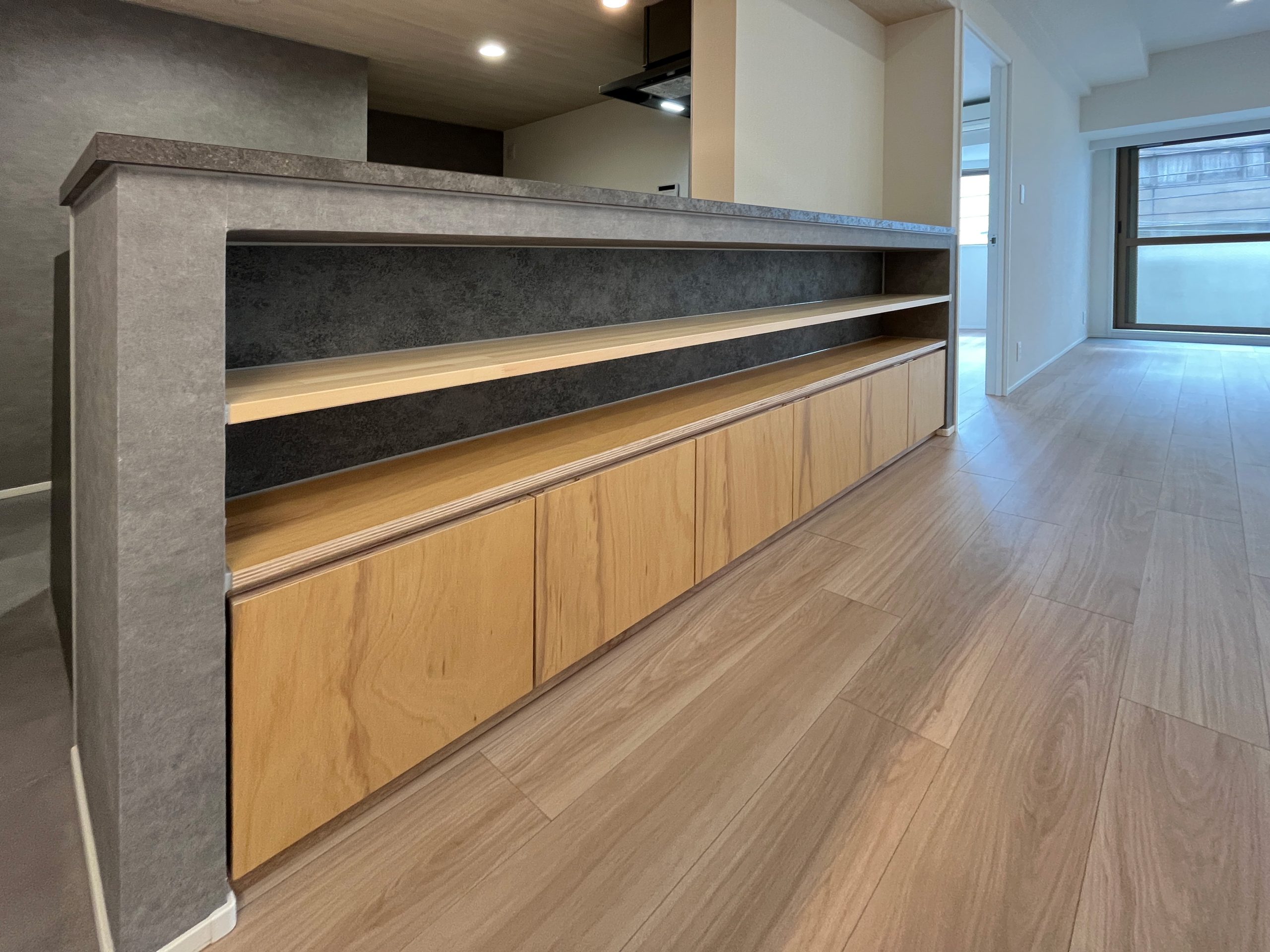 もともと縦に長く扱いずらかったLDKを見直し、空間の流れに沿って収納やキッチンの配置を再設計。キッチンは閉鎖的な壁付けから、腰壁に収納を付けたカウンターキッチンへ変更。手元は隠しながらも、リビングやダイニングとのつながりをつくることで、家族との会話や気配が自然と交わる設計にしました。 収納のポイントは、“閉じない”収納棚と間接照明で魅せる演出。しまうだけでなく、空間を整えながら暮らしの一部を楽しめる仕掛けです。 毎日の家事や会話がスムーズにできることで、家族がのびのびと過ごせるお部屋を実現しました。「ひらいてつながる」ことで、家族の動線と暮らしがすっきり整います。