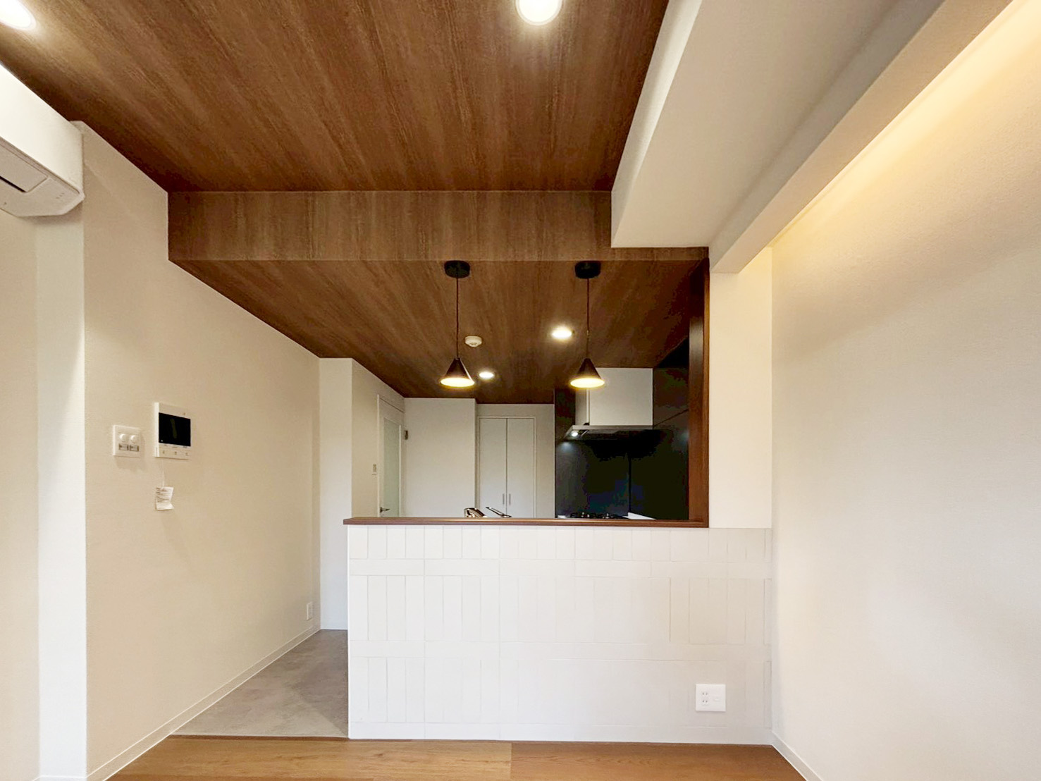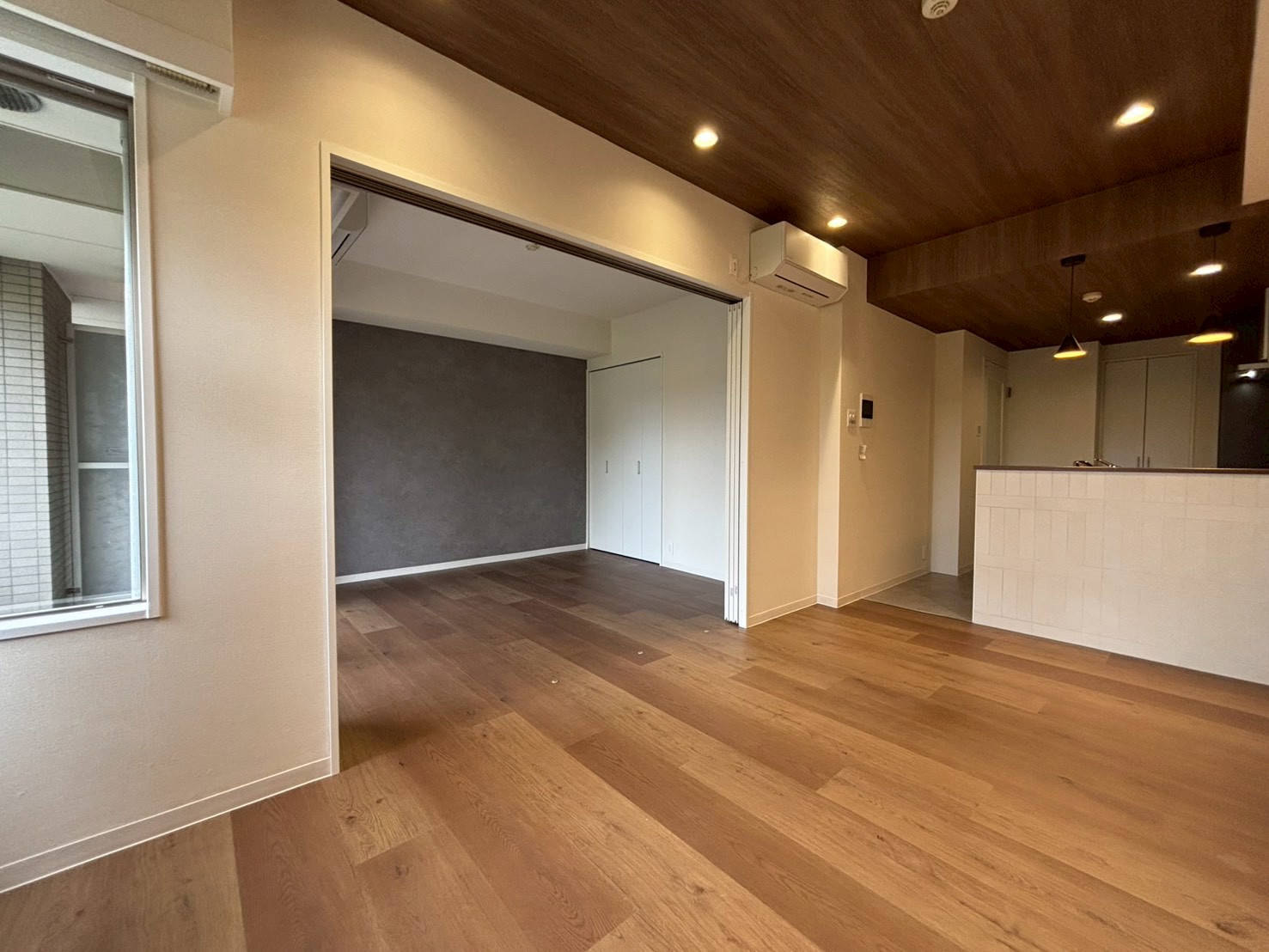 約44㎡のワンルームを、暮らしにメリハリが生まれる1LDKへリノベーション。大きな窓から自然光がたっぷりと差し込み、開放感のある明るい空間が広がります。落ち着いたブラウンを基調とした内装に、木目クロスとコーブ照明を組み合わせ、光と陰影がやわらかく重なる居心地の良さを演出。LDKと洋室は3枚片引き戸で仕切られており、開け放てばひと続きの広がりが生まれ、閉じれば静かなプライベート空間に。自然光と木の温もりに包まれながら、開く・閉じるを自由に選べる、"ちょうどいい距離感"で暮らせる住まいです。 気取らず、心地よく。毎日をちょうどよく楽しめる住まいに仕上がりました。