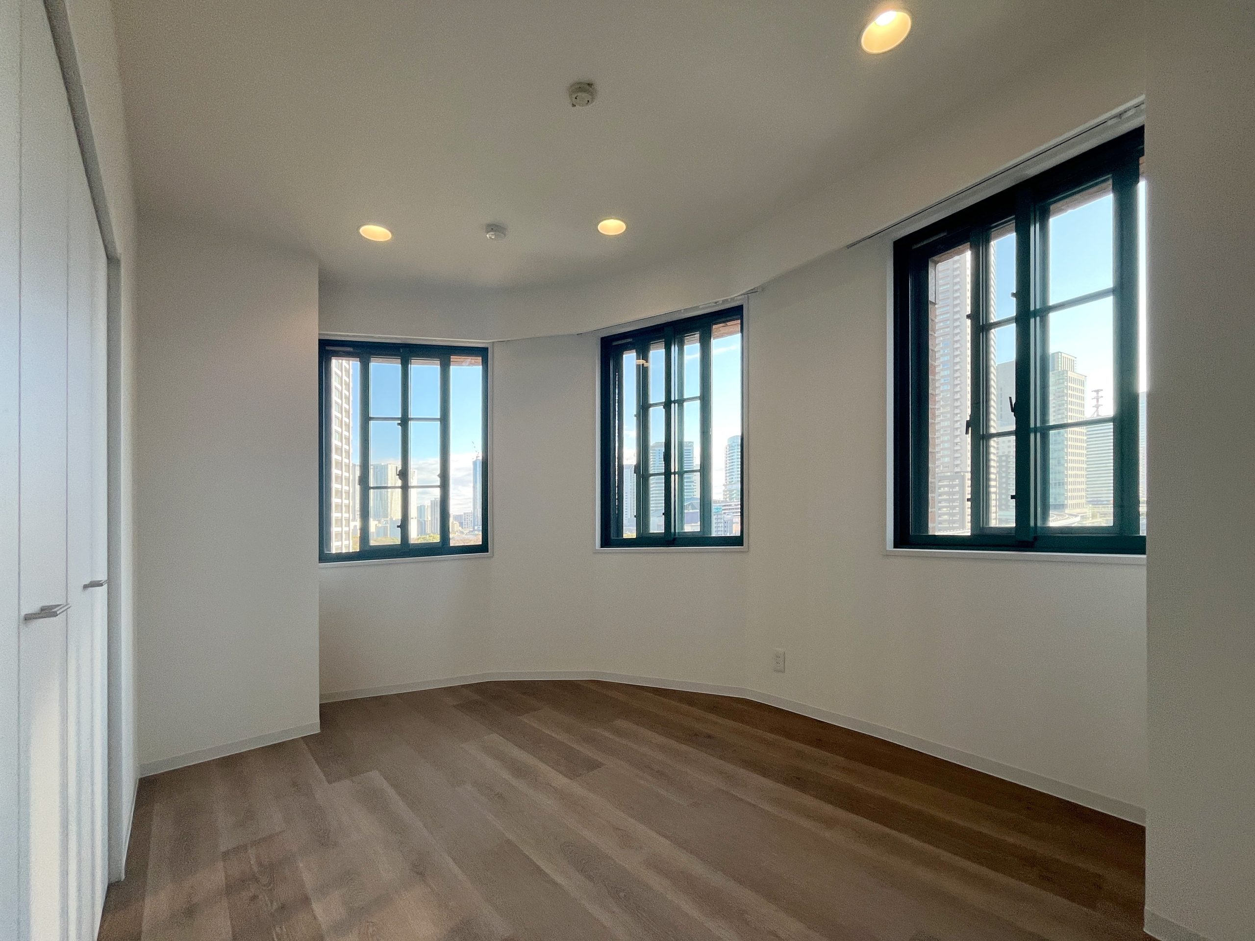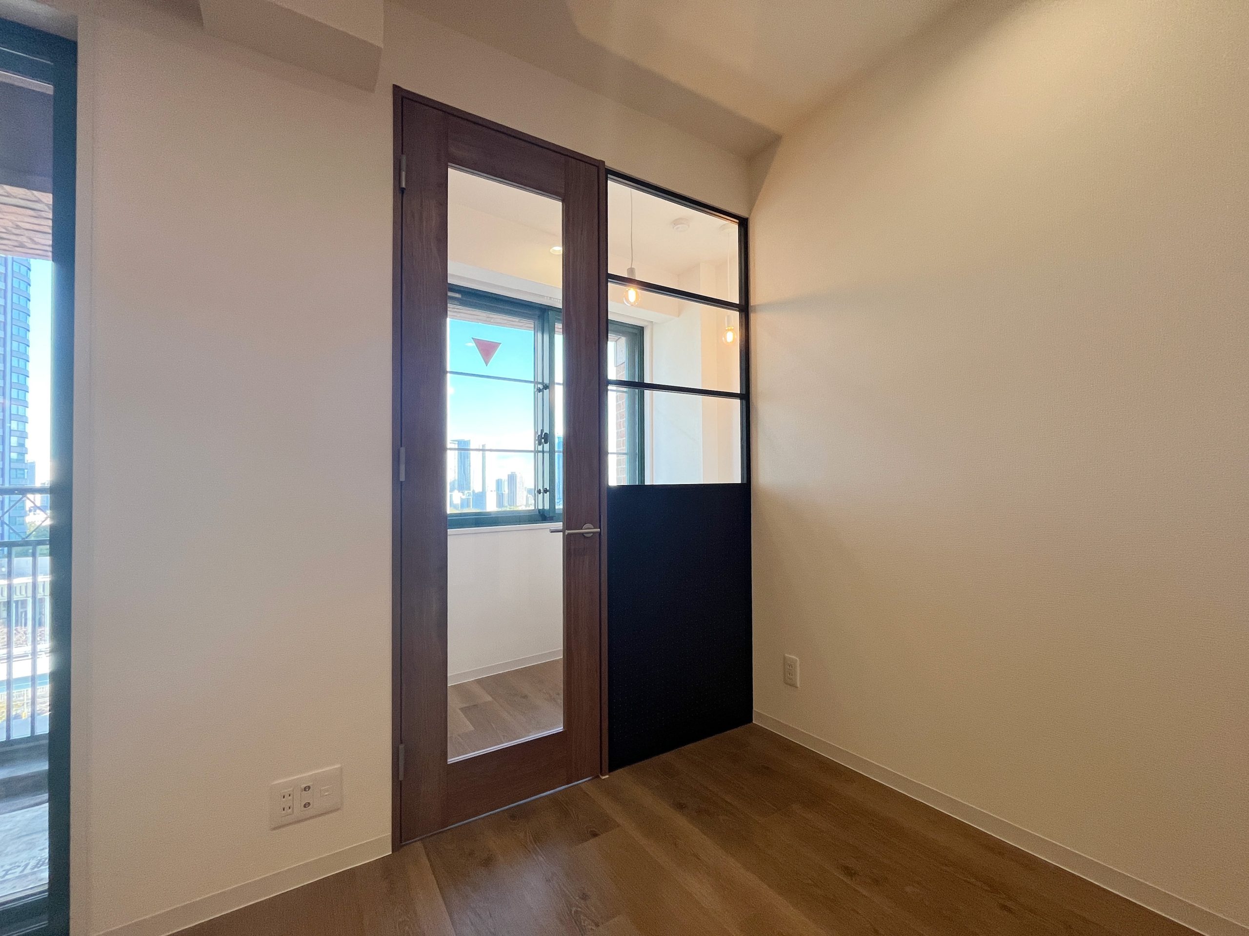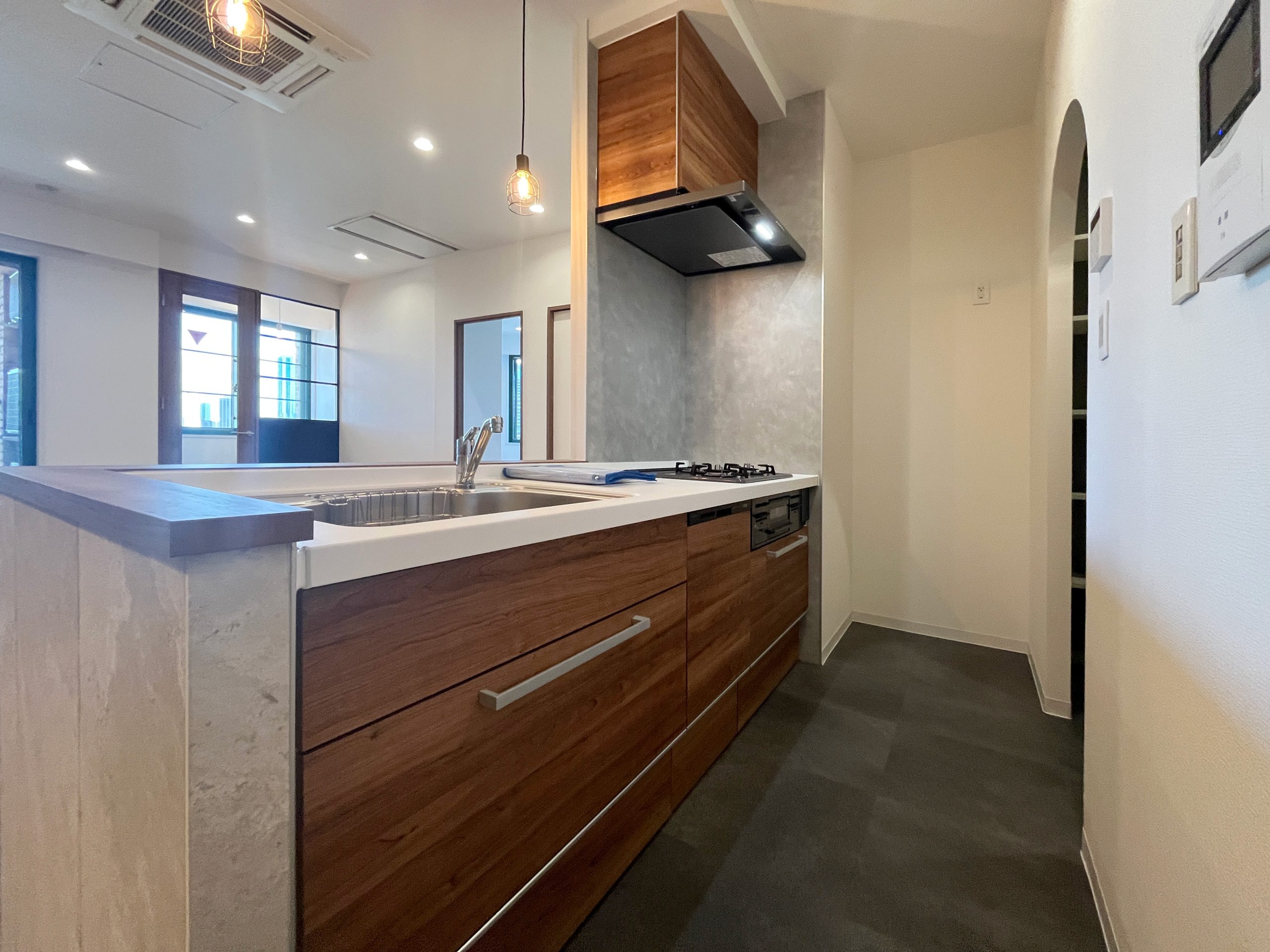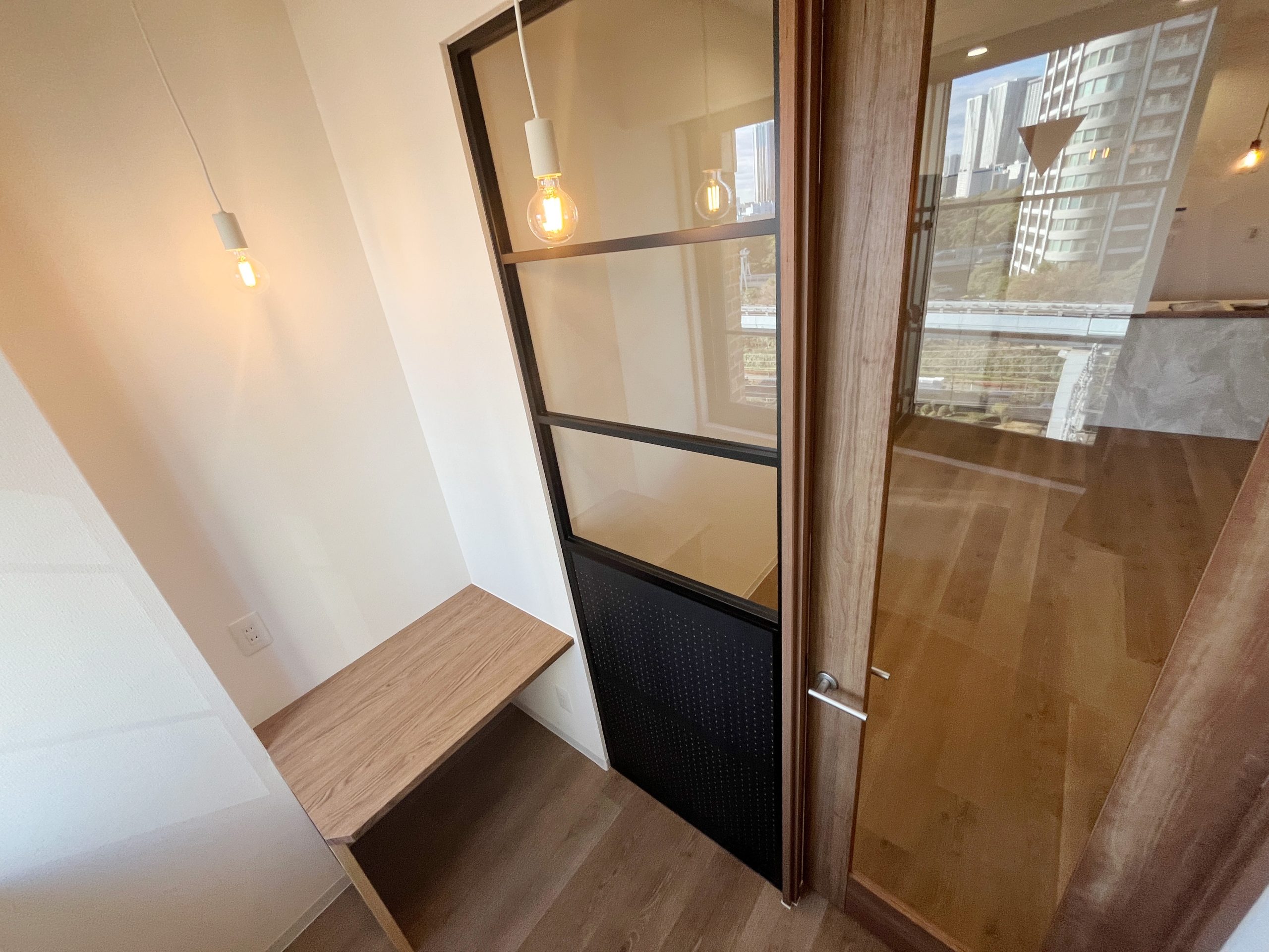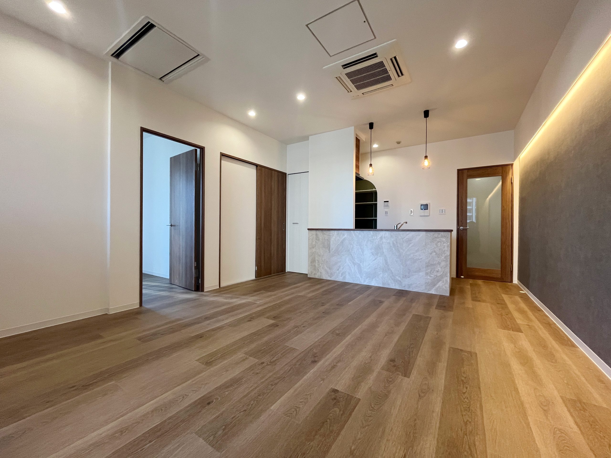 SOHO利用を前提とした1Kを、暮らしやすさとデザイン性を兼ね備えた2LDKへと一新しました。シャワーブースしかなかった水回りはユニットバスを新設し、独立した使いやすい空間へ。キッチン背面のパントリーや、LDKの収納、各居室のクローゼットにより、日々の暮らしをすっきり整えられます。 書斎には、L字型カウンターデスクを設置。リモートワークにも趣味の作業にも心地よく対応でき、ペンダントライトの光が空間をおしゃれに演出します。さらに広い壁面にはアクセントクロスと間接照明を組み合わせ、陰影が映える上質な雰囲気をプラス。パントリーや書斎の入り口にはアールを取り入れ、柔らかな表情と洗練さを合わせ持つ住まいへと生まれ変わりました。