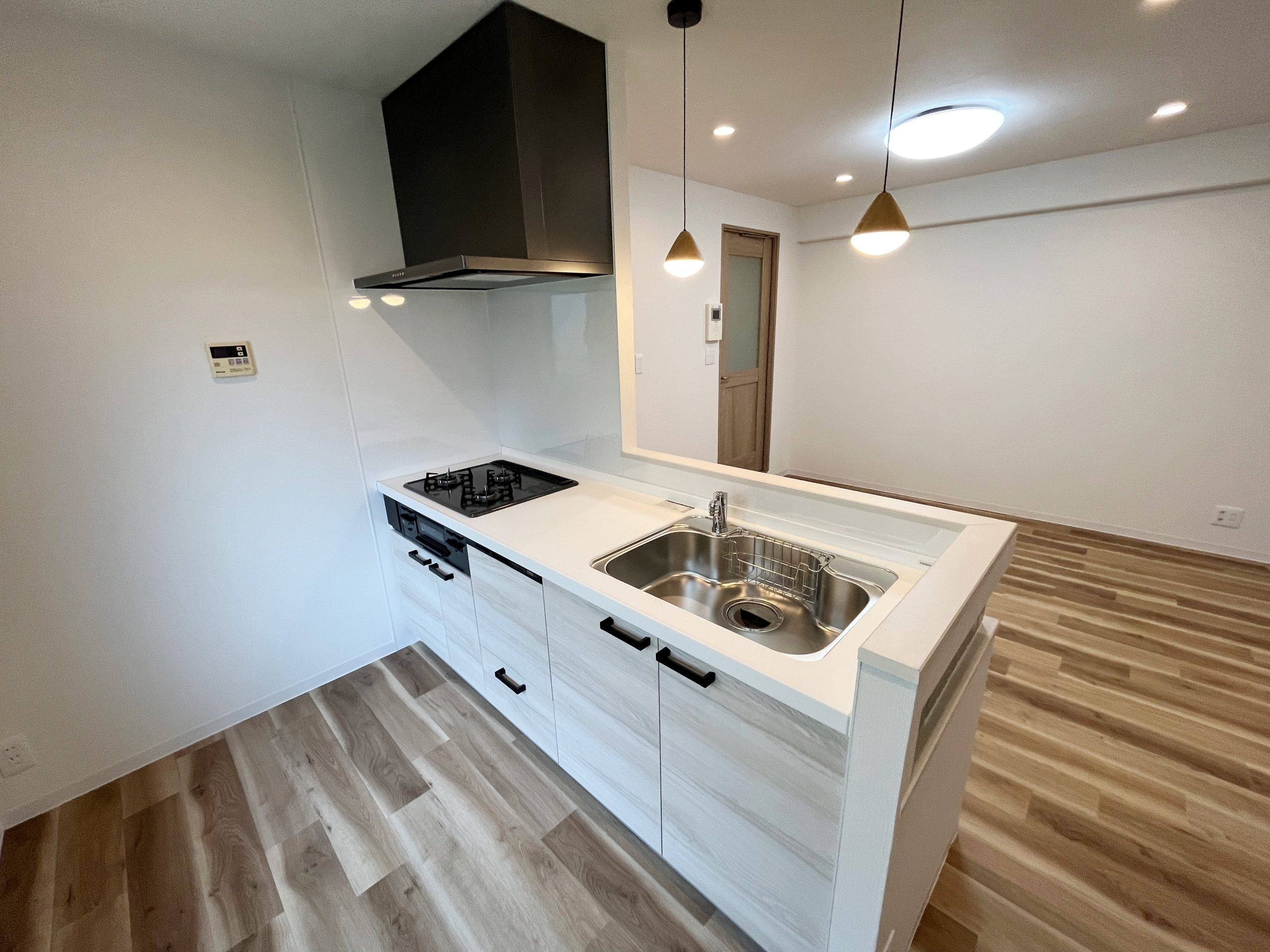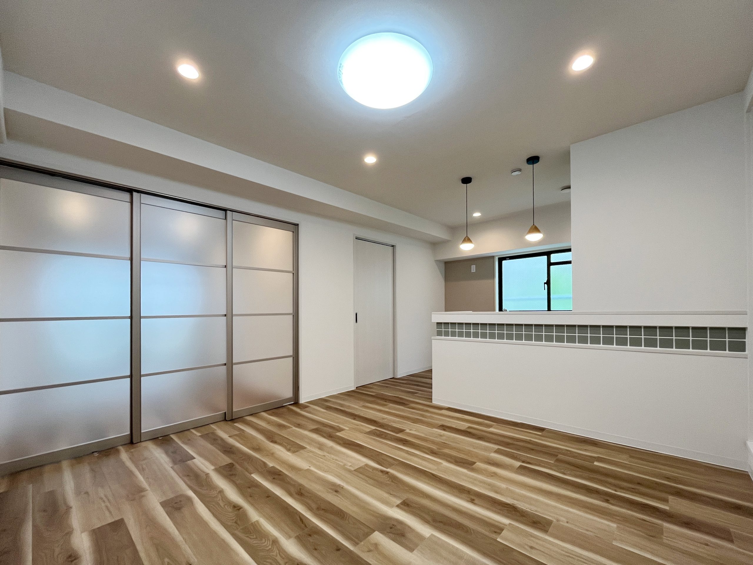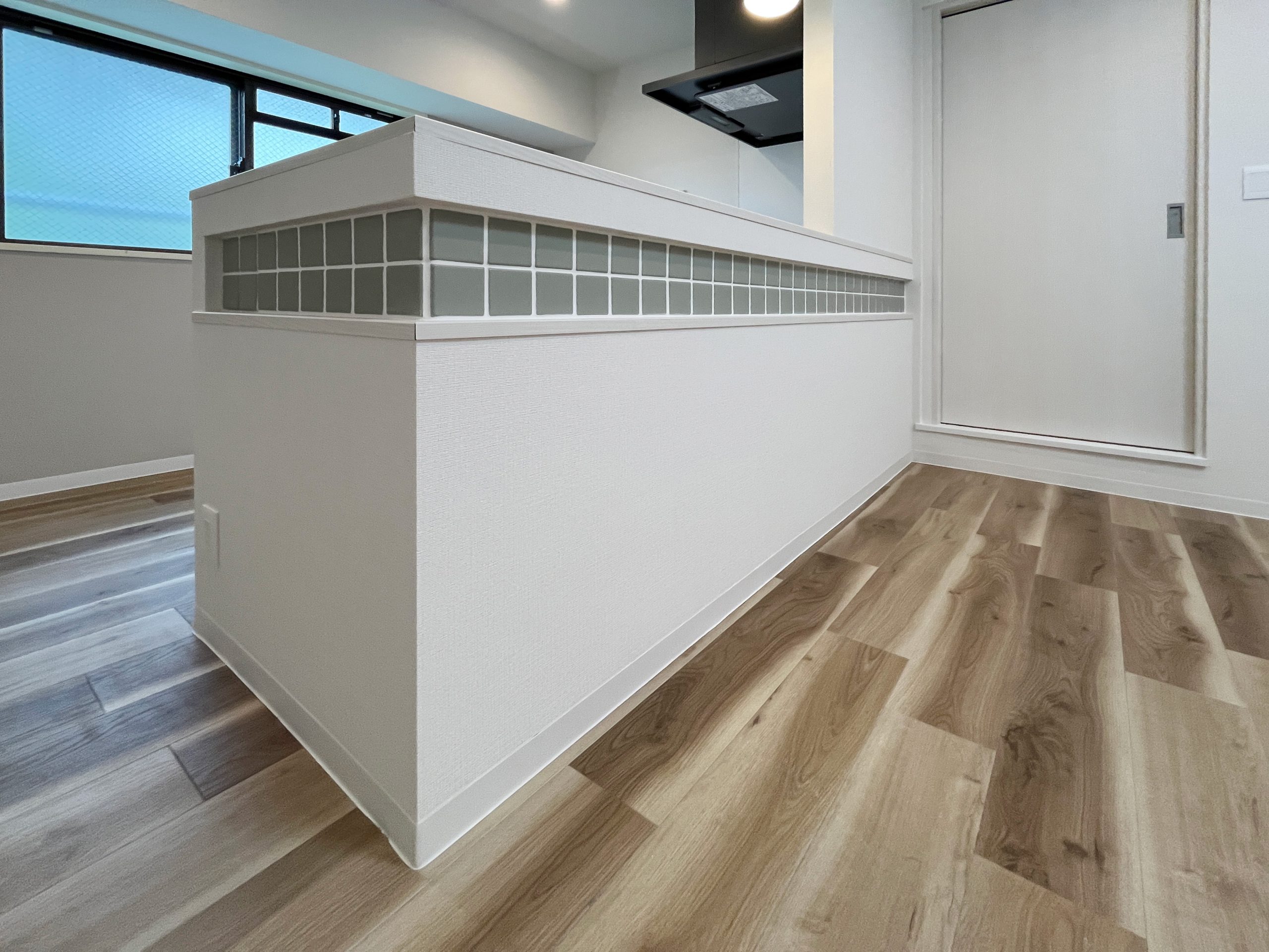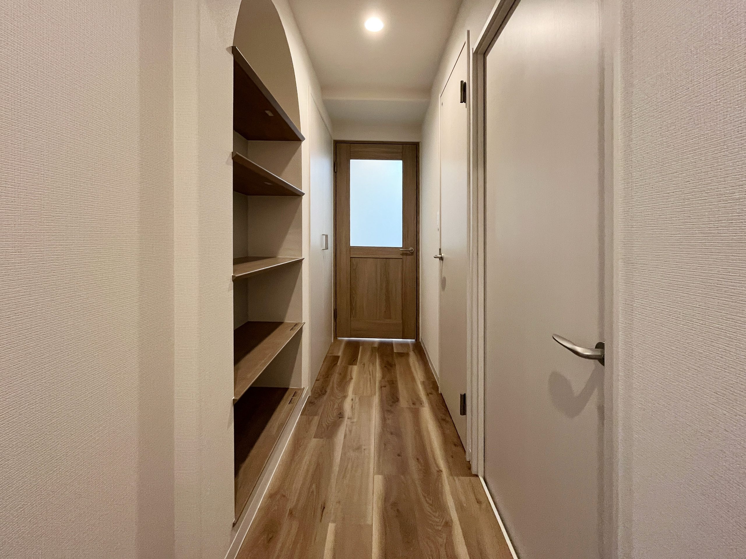 このお部屋の特徴はなんといってもアーチ壁。玄関入ってすぐの廊下とパントリーの入り口にアーチ壁を設けました。現在収納として使用されている廊下部分にアーチ壁のニッチを作成。棚板を取り付けるため収納力は落とさず、デザイン性をプラスしました。部屋を訪れた人が必ず通る場所にデザイン性のあるニッチを取り入れることで、そこに住む人の個性を飾ることができます。 LDKの一角にもアーチ壁を導入。建具で仕切るのではなく、曲線の壁で仕切ることで、空間を広く、開放的に見せる効果をもたらします。その他キッチンの腰壁や洗面台には特徴的なタイルを選択。シンプルながらもタイルやアーチ壁がこのお部屋にしかない個性を生み出します。
