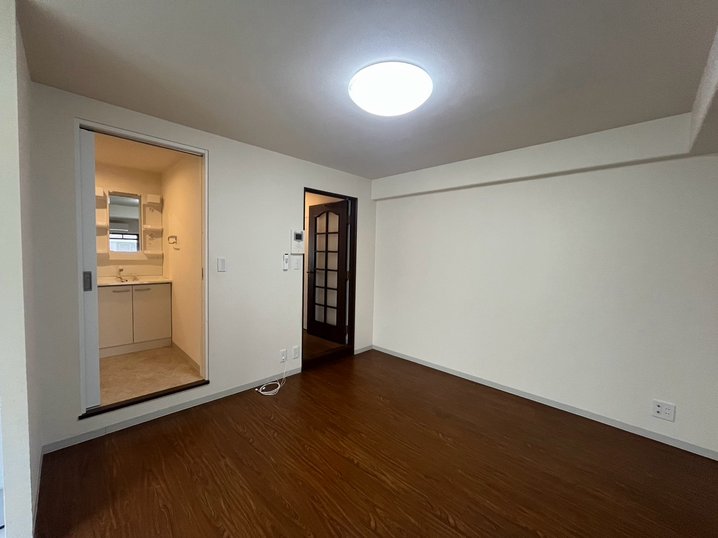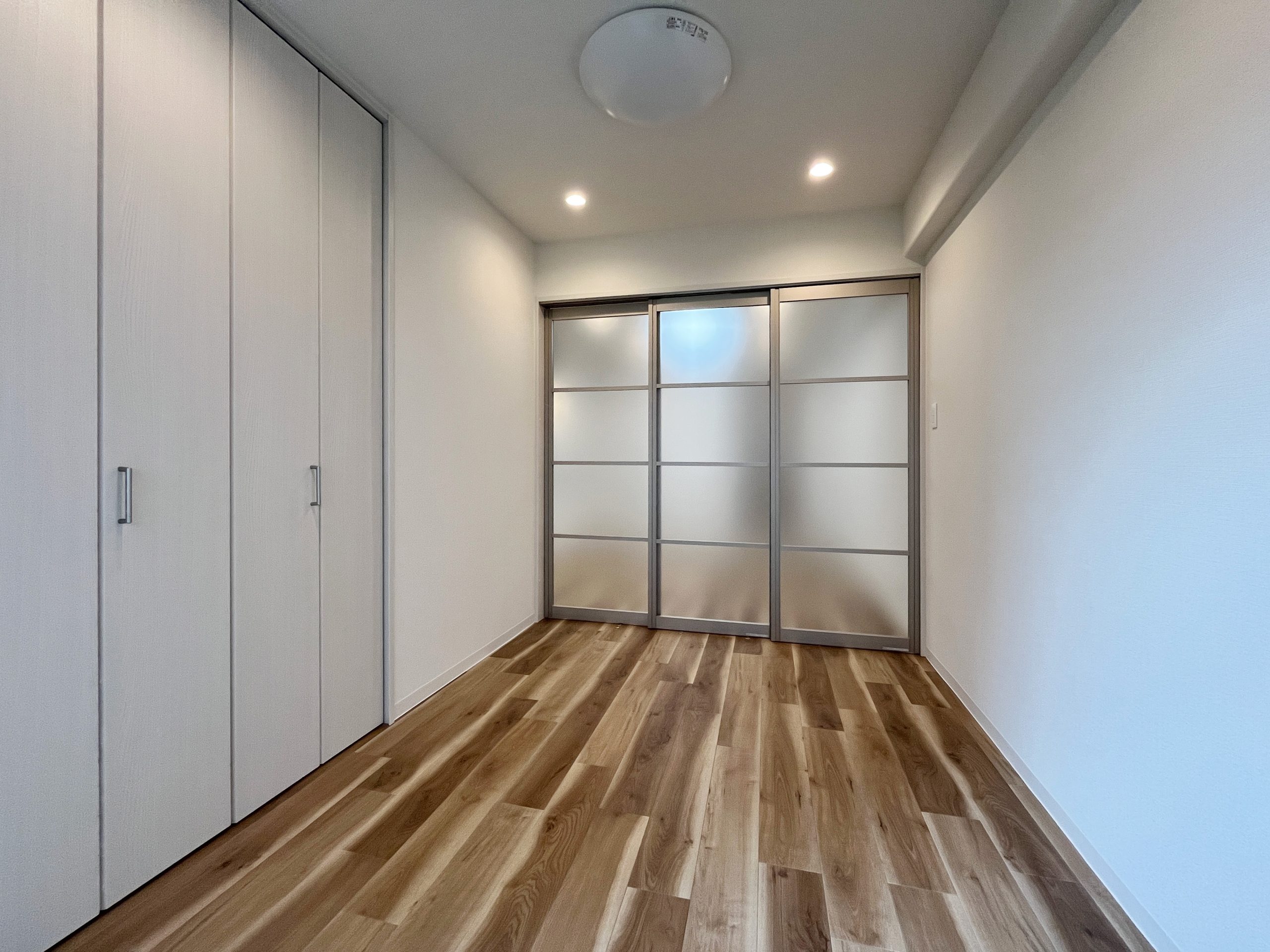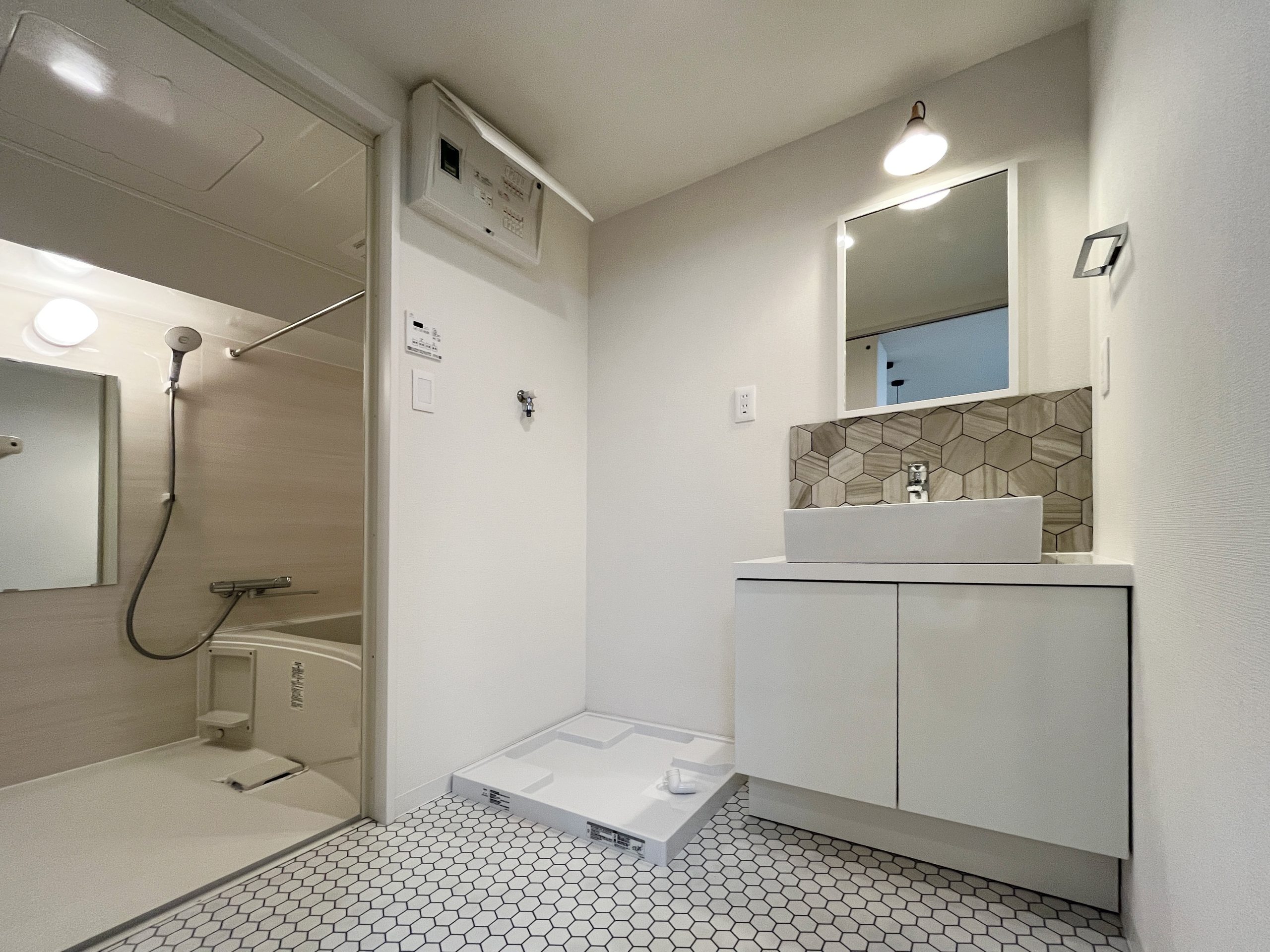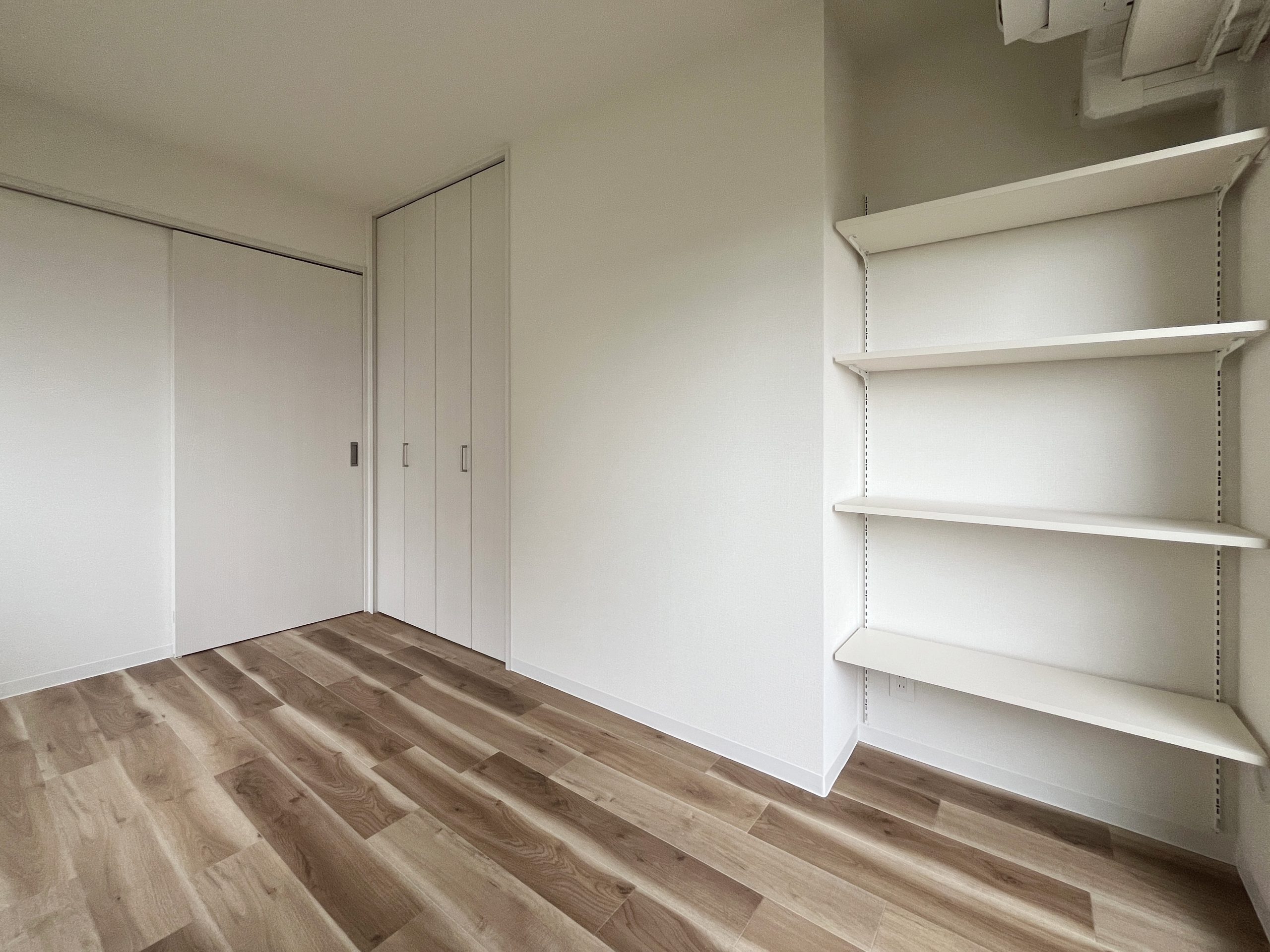 このお部屋の特徴はなんといってもアーチ壁。玄関入ってすぐの廊下とパントリーの入り口にアーチ壁を設けました。現在収納として使用されている廊下部分にアーチ壁のニッチを作成。棚板を取り付けるため収納力は落とさず、デザイン性をプラスしました。部屋を訪れた人が必ず通る場所にデザイン性のあるニッチを取り入れることで、そこに住む人の個性を飾ることができます。 LDKの一角にもアーチ壁を導入。建具で仕切るのではなく、曲線の壁で仕切ることで、空間を広く、開放的に見せる効果をもたらします。その他キッチンの腰壁や洗面台には特徴的なタイルを選択。シンプルながらもタイルやアーチ壁がこのお部屋にしかない個性を生み出します。